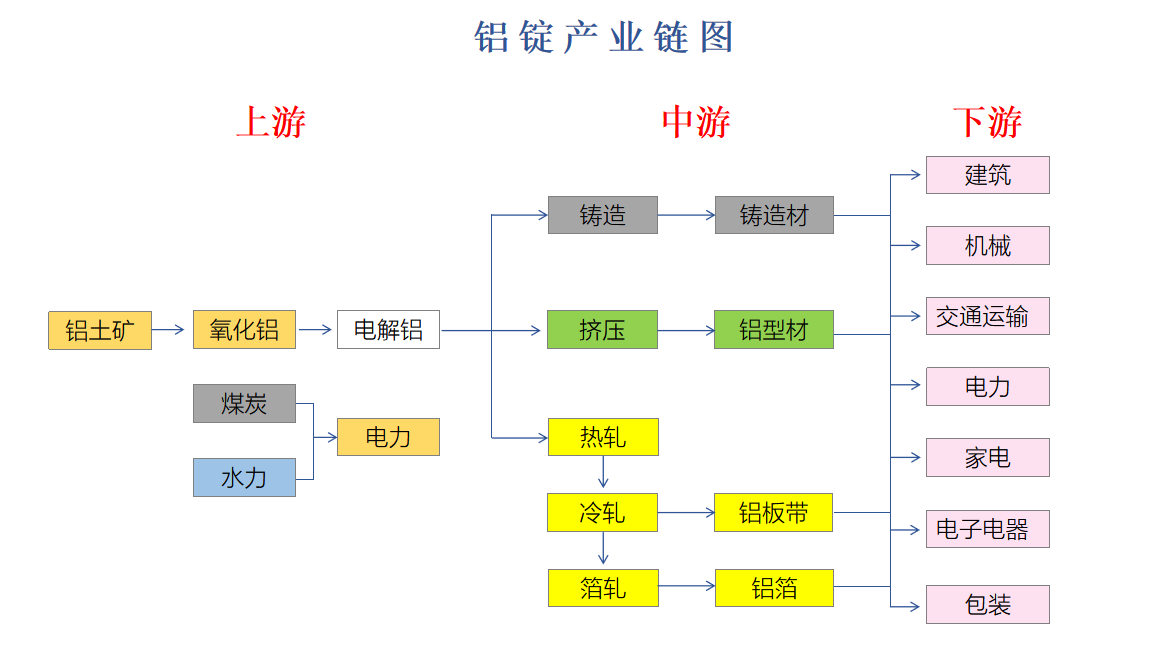 在以下产业链图中,铝锭处于中游产业,原料是无法直接使用于各行业,需经过氧化电解到达中端产业,再多重加工提炼用于各类行业。