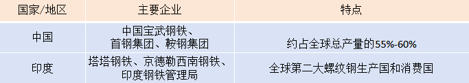 1.中国绝对主导,占全球总量的55%,主产地河北、江苏、山东,龙头为中国宝武、河钢、沙钢。