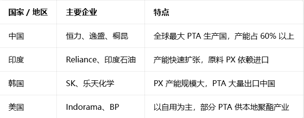 ③ PTA产能分布:中国占全球PTA产能的60%以上,其次是印度、韩国、美国。