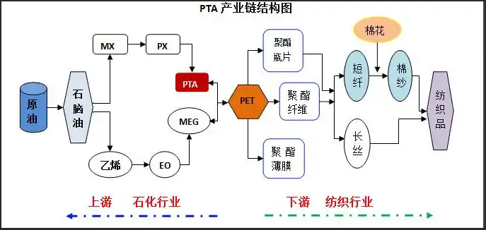 PTA产业链从原油开始,经过多个加工环节,最终用于生产聚酯,其核心流程如下: