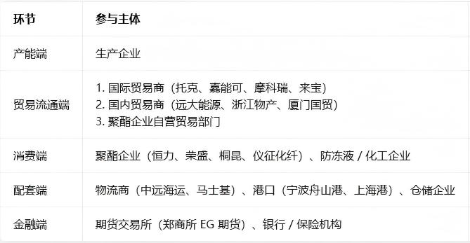 乙二醇贸易主体以国际大宗商品贸易商和国内龙头贸易企业为主,长约锁定基础流量,现货 / 期货调节短期波动。