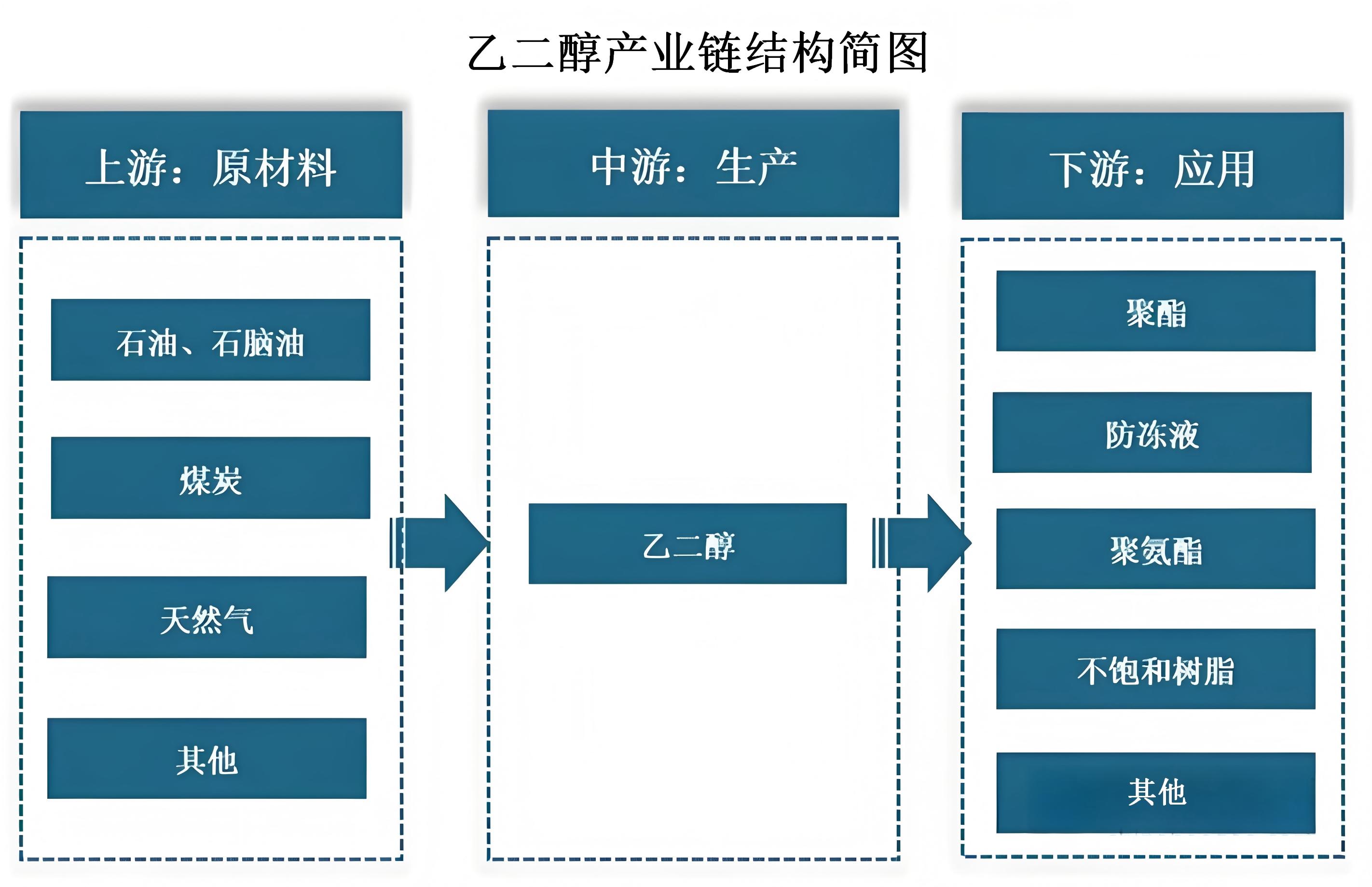 乙二醇产业链上游环节为原材料,主要包括石脑油、乙烯、天然气、煤炭与催化剂等,中游为生产与供应环节;下游应用于聚酯、防冻液、冷却液、精细化工等领域。